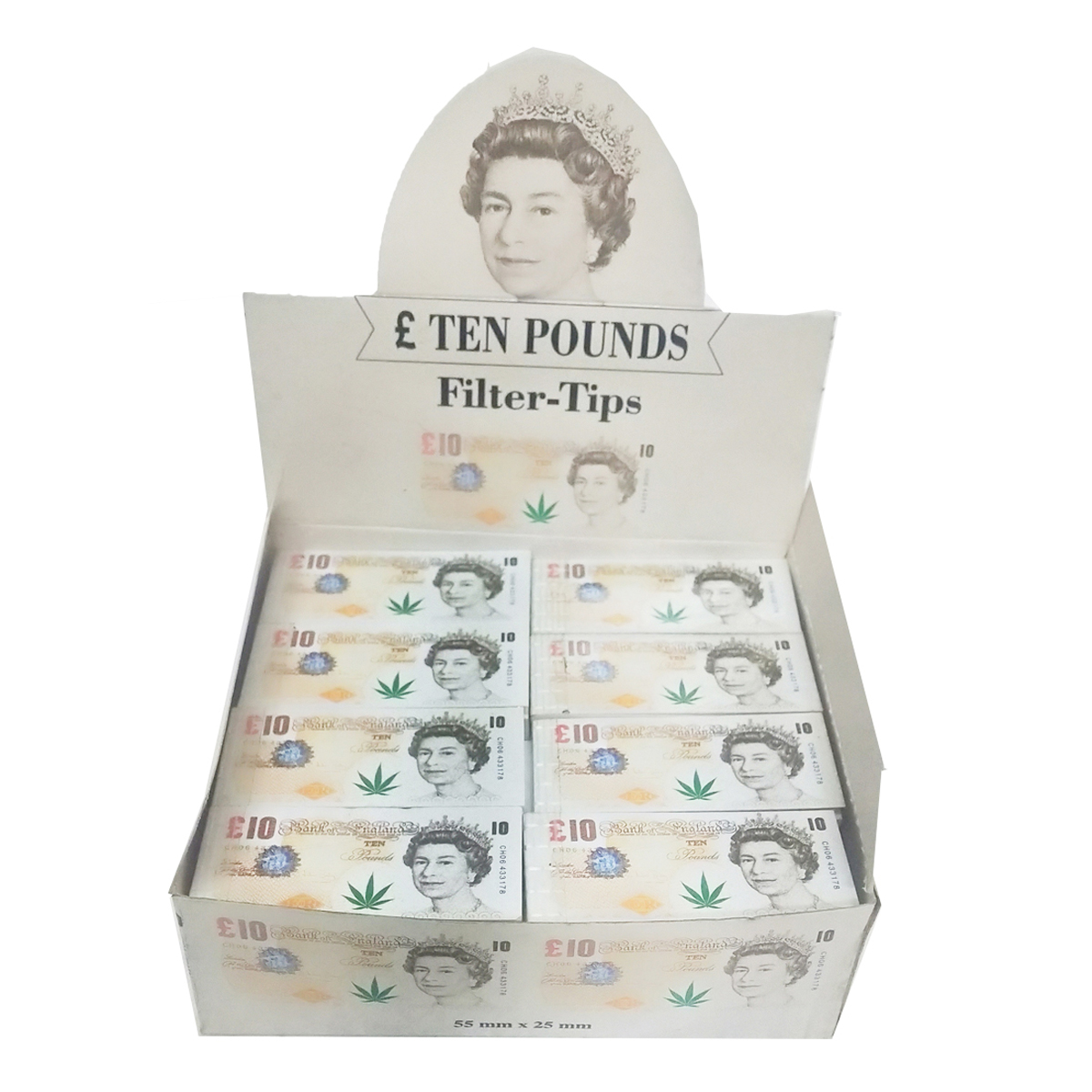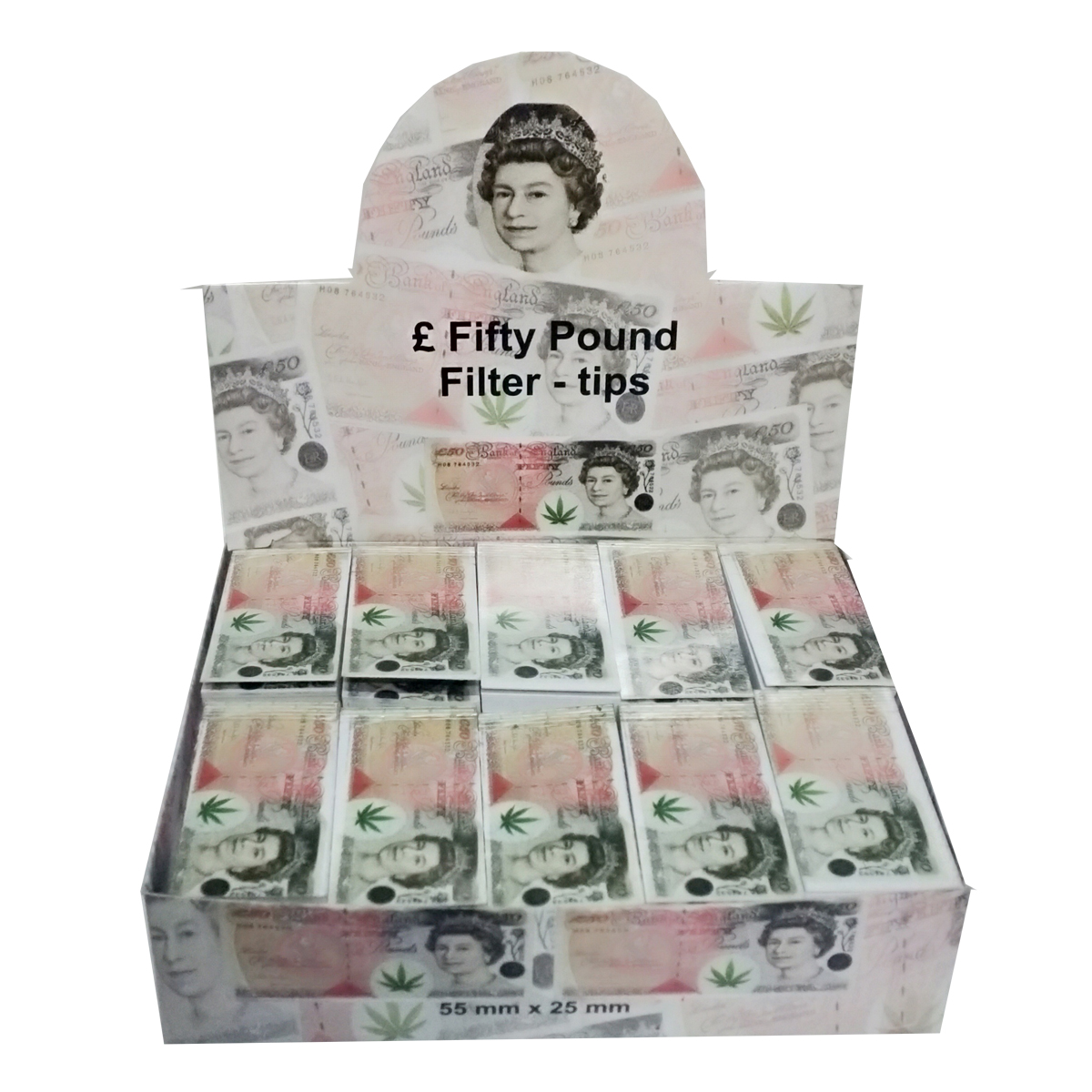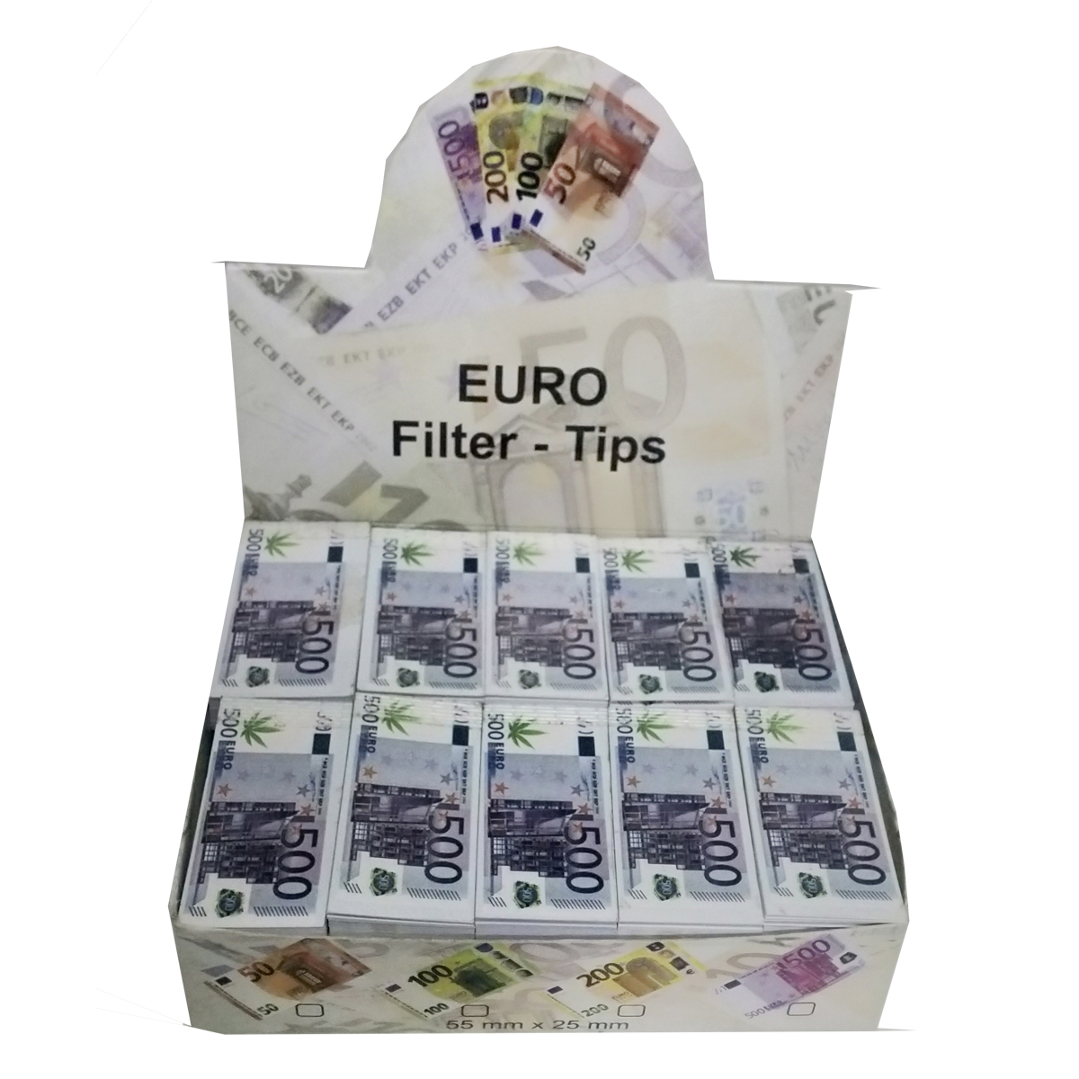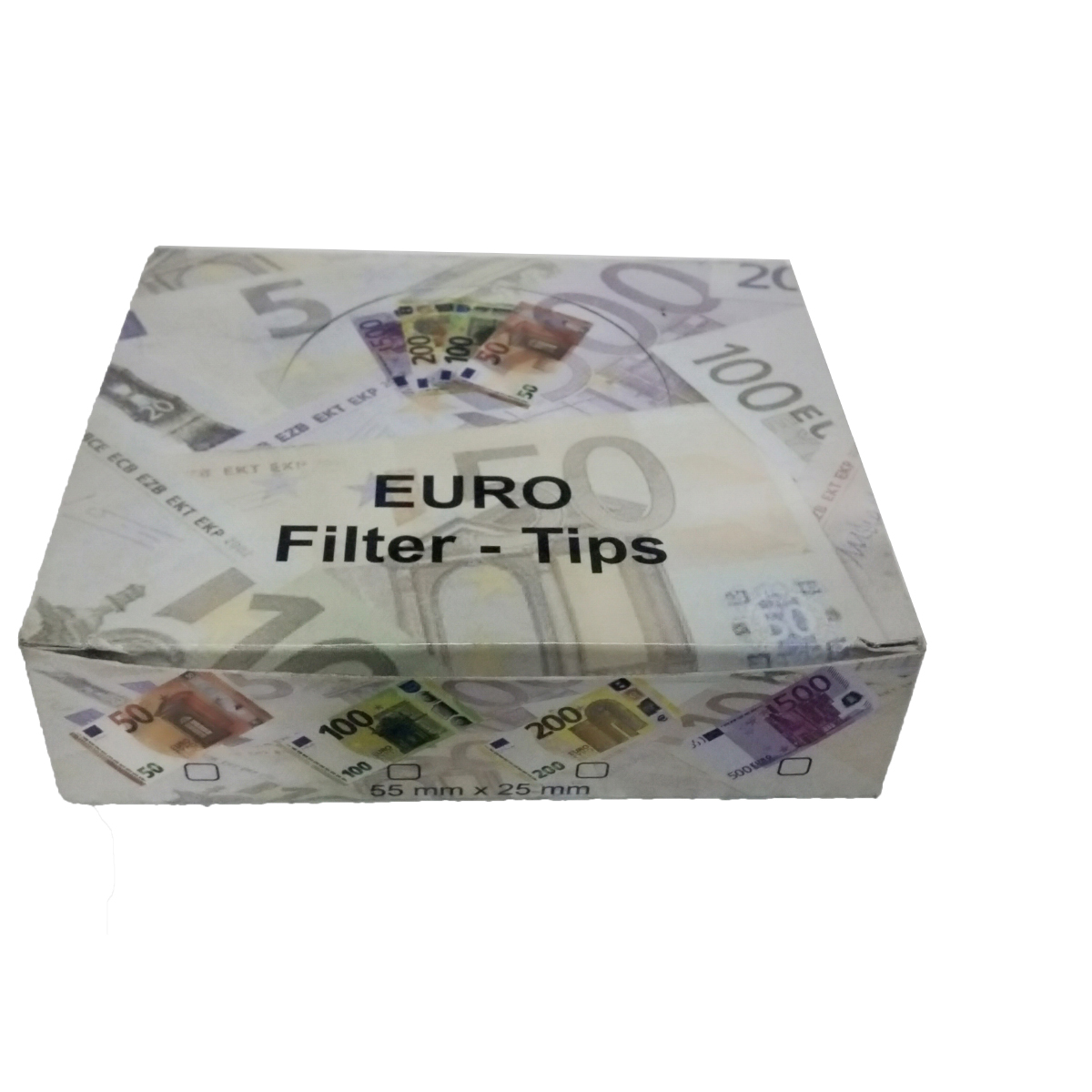 100 Euro Filter Tips Pack of 40 Size - 55x25mm Each Page / Tip Printed Each Booklet Contains 40 Filter Tips 1 Box With 40 Individual Booklets Made Of Natural Products Chemical & Chlorine Free Flexible and Easy-to-Roll Perfect Cylinders