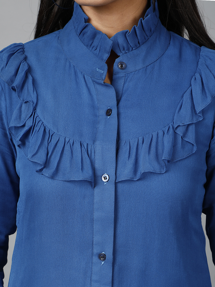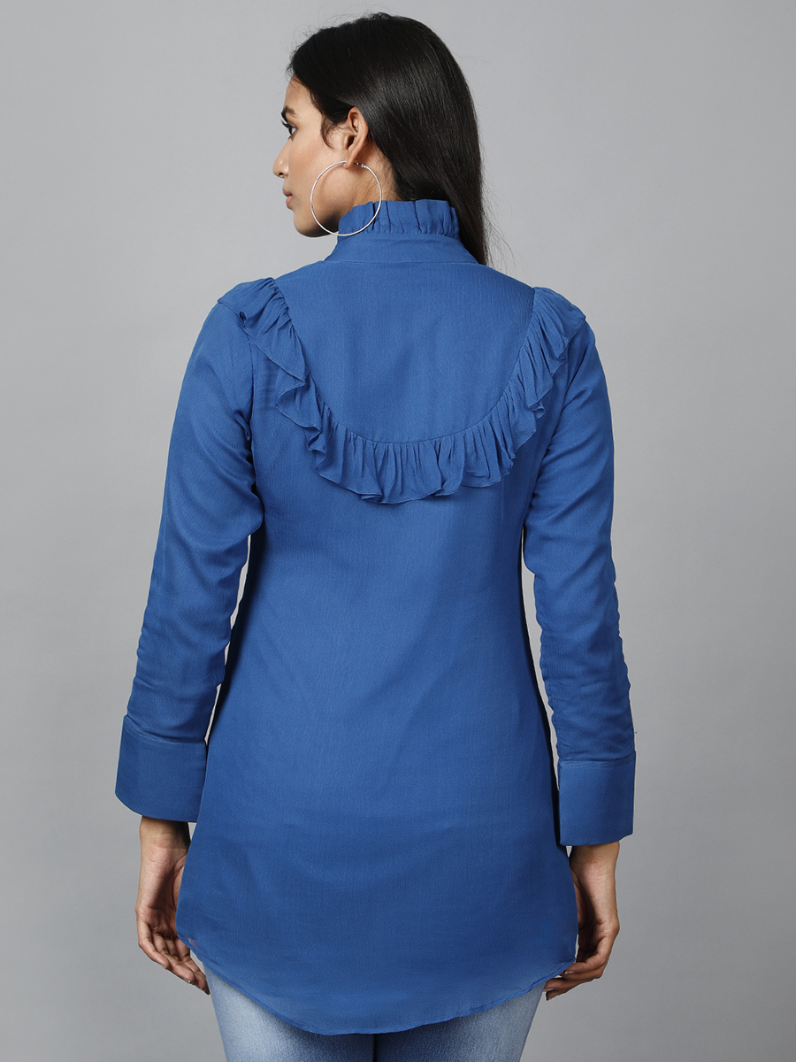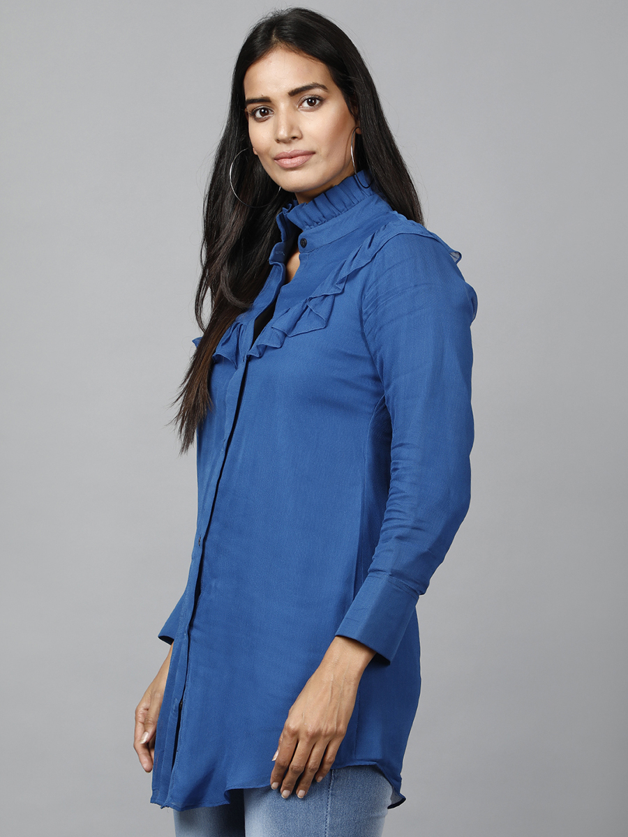Enchanting hues with beautiful ruffles gives you a precise contradiction between simplicity and modernism.Thus, making this blue shirt an absolute-have in your wardrobe.