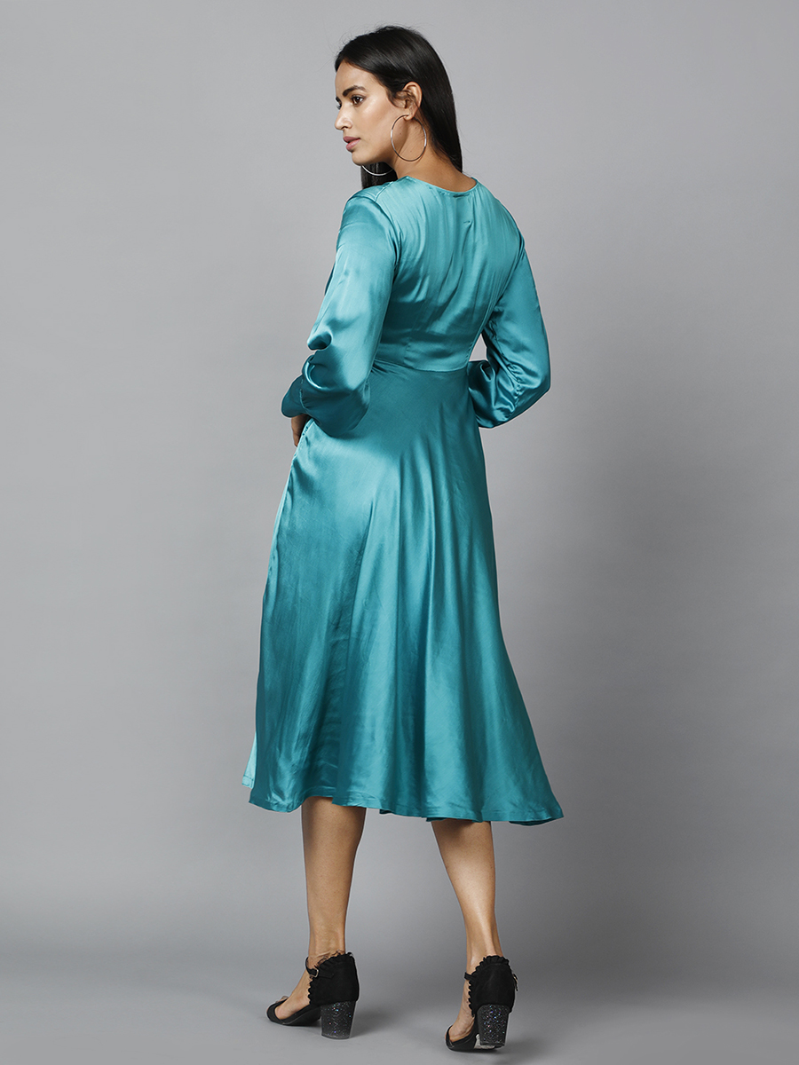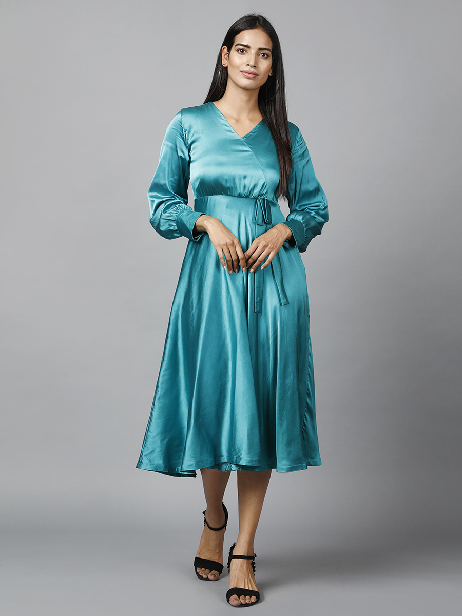 Update your style game with some elegance. Dress like a lady boss in this mesmerizing green satin wrap dress perfect for your formal meetings or office parties.