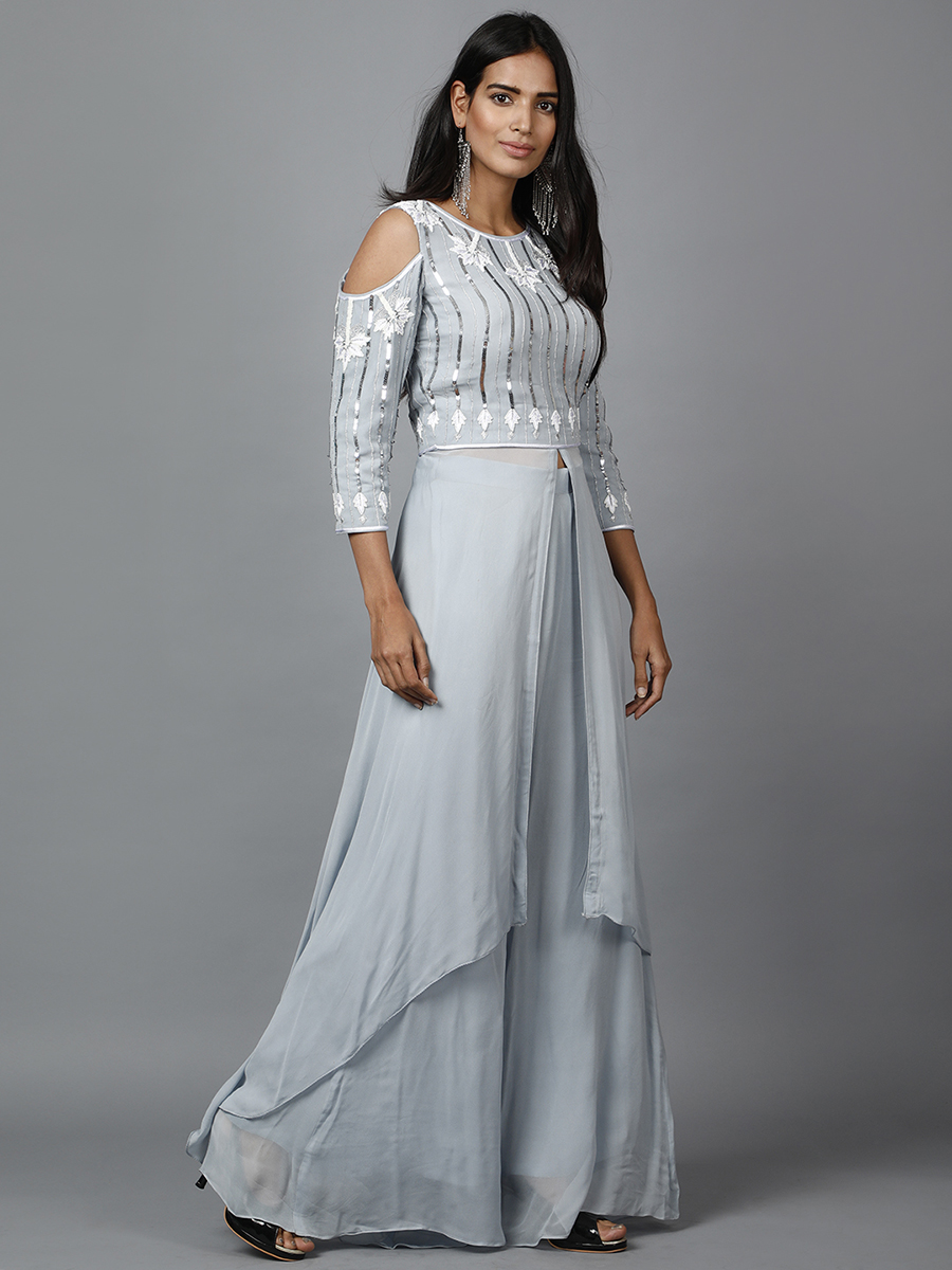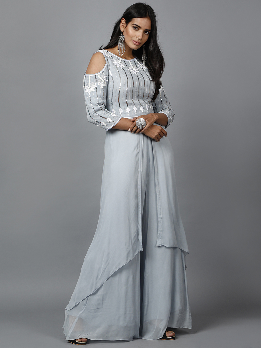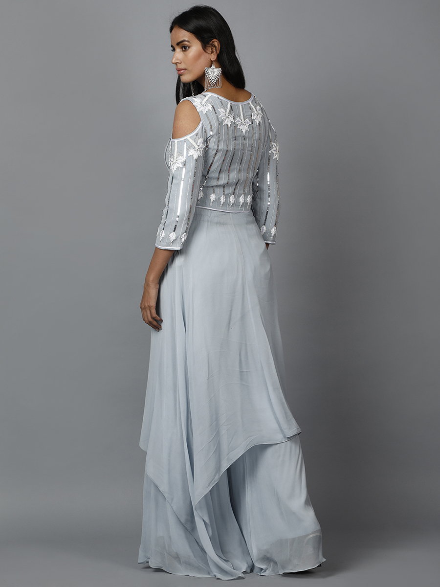 This elegant light grey cold shoulder kurta in georgette base, has machine embroidery and sequins work all over the top and georgette flare. It is finished with shantoon lining. Along with the kurta is a shantoon pallazo. The piece looks very beautiful and graceful on body as worn by the model. It is available in all sizes.