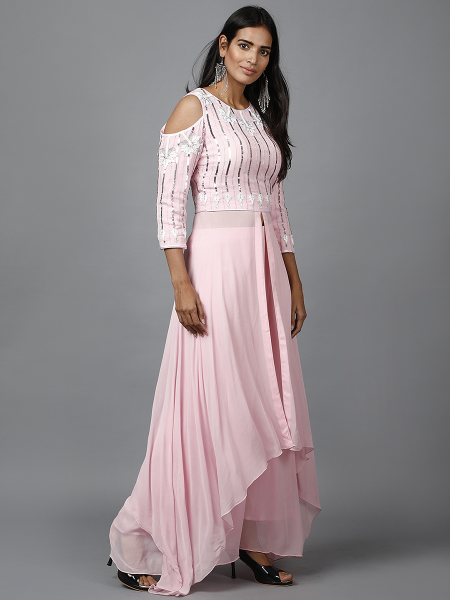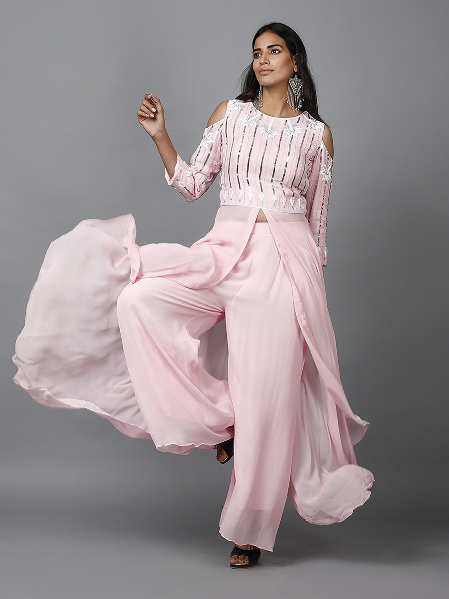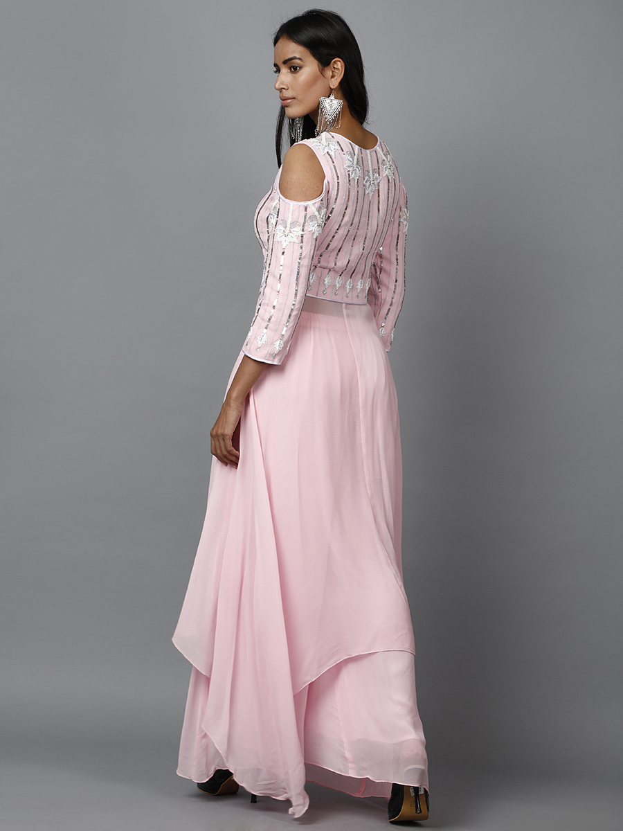 This elegant light pink cold shoulder kurta in georgette base, has machine embroidery and sequins work all over the top and georgette flare. It is finished with shantoon lining. Along with the kurta is a shantoon pallazo. The piece looks very beautiful and graceful on body as worn by the model. It is available in all sizes.