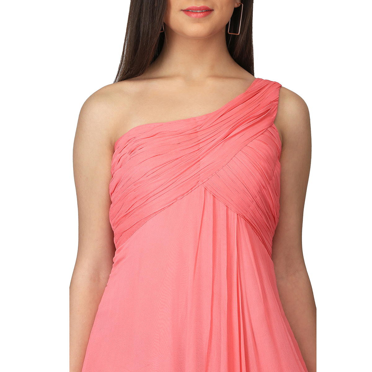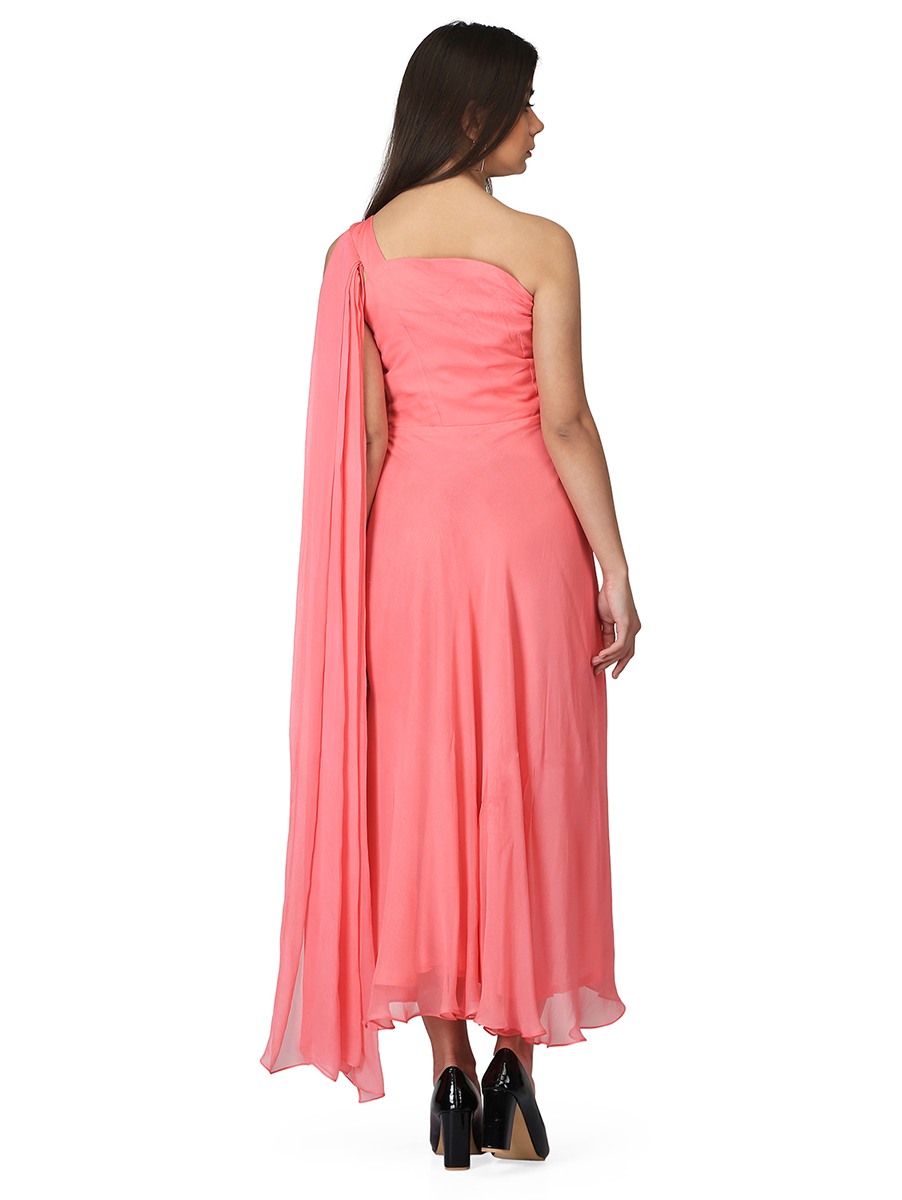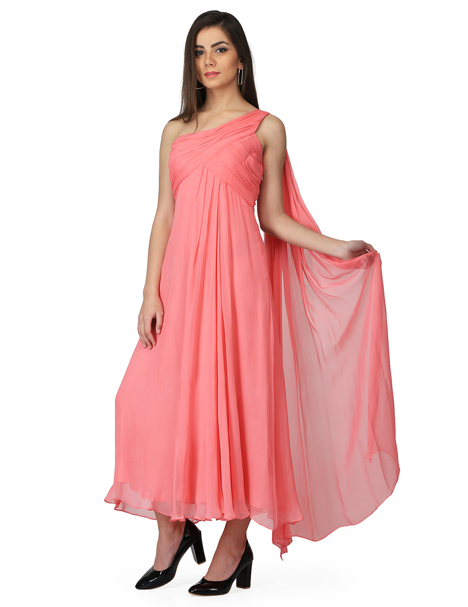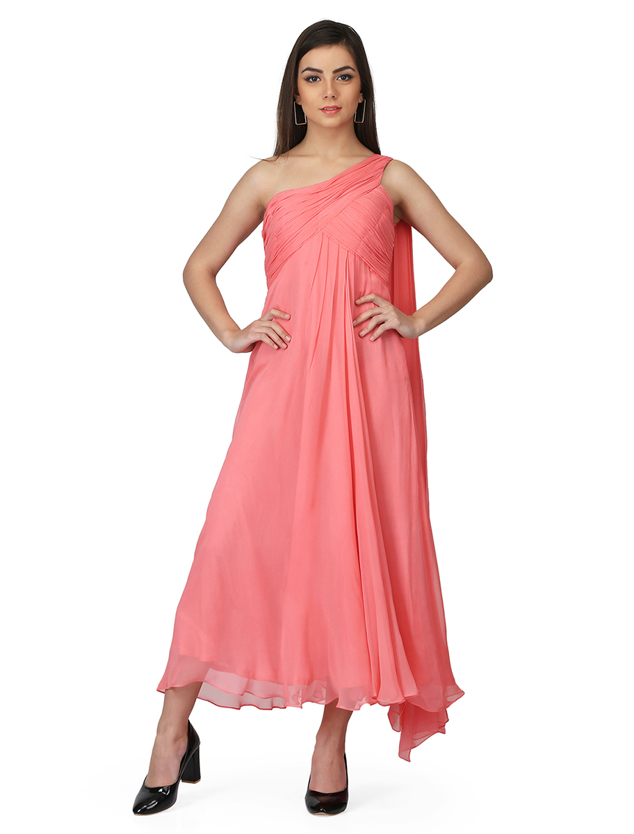 Step up your evening style games as you slip into this mesmerizing pink one-shoulder draped gown. Wear the style for any occasion be it a casual or an office party, you can never go wrong with this stunning pink gown.