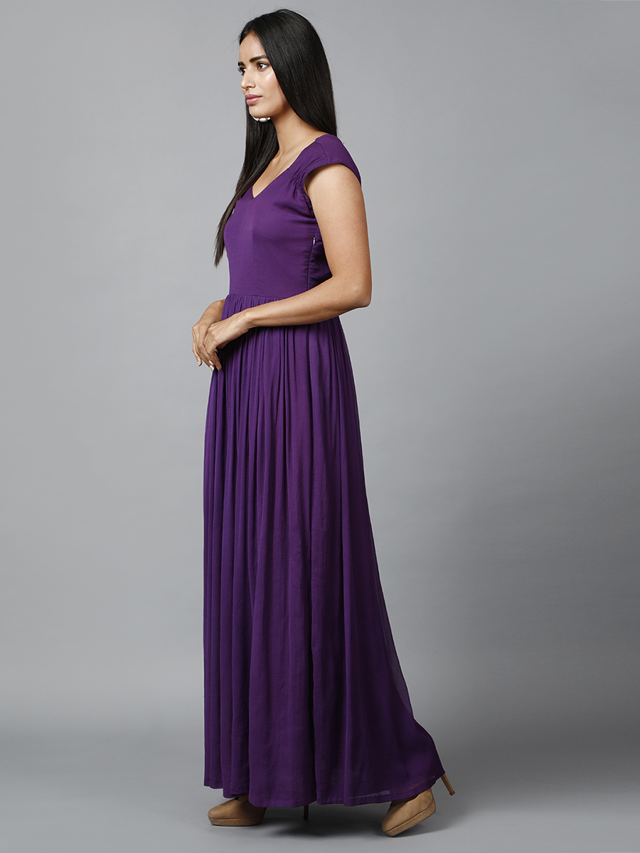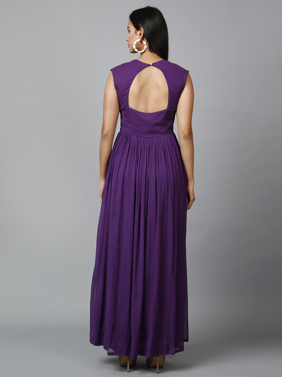Step up your style games with this stunning draped gown. Designed elegantly in the charms of purple hues. Just pair the look with black heels and statement earrings and you're good to go.